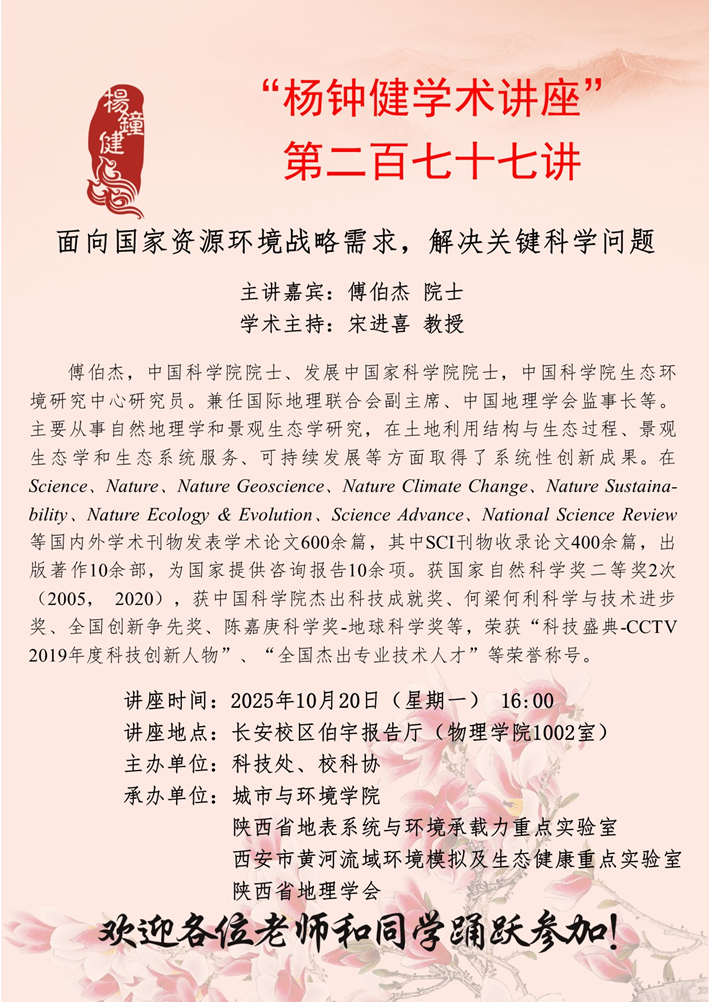 2025年10月20(星期一)下午16:00,由我校科技处、校科协主办,城市与环境学院、陕西省地表系统与环境承载力重点实验室、西安市黄河流域环境模拟及生态健康重点实验室、陕西省地理学会承办的“杨钟健学术讲座”第二百七十七讲在长安校区物理学院伯宇报告厅举行。中国科学院院士、发展中国家科学院院士、中国科学院生态环境研究中心傅伯杰研究员应邀作了题为“面向国家资源环境战略需求,解决关键科学问题”的学术报告。本次学术讲座由宋进喜教授主持,我院师生积极参与。